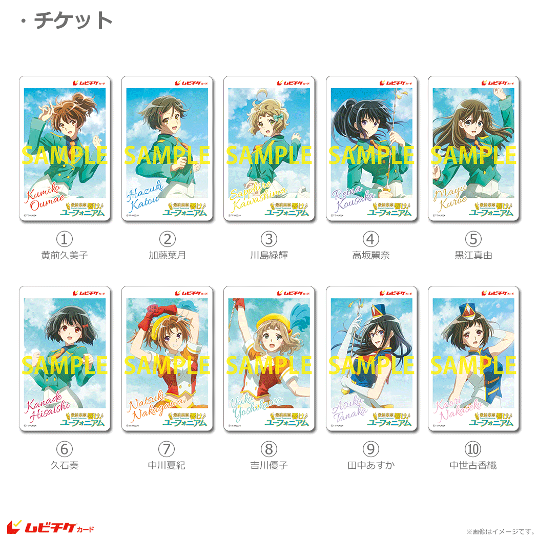 ★【〈サンフェス!コレクション〉描きおろしペアムビチケカード】は《①黄前久美子/②加藤葉月/③川島緑輝/④高坂麗奈/⑤黒江真由/⑥久石奏/⑦中川夏紀/⑧吉川優子/⑨田中あすか/⑩中世古香織》の全10種から2枚をお選びいただくセット販売となります。