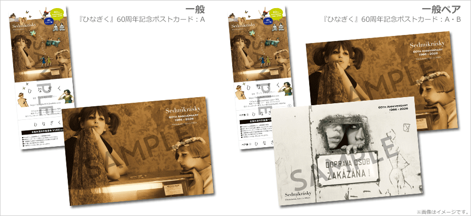 - 一般券1枚につき【『ひなぎく』60周年記念ポストカード:A】が1枚、一般ペア券1枚につき【『ひなぎく』60周年記念ポストカード:A・B】が1セット付きます。