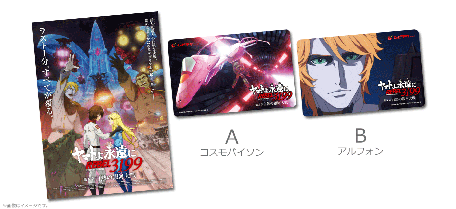 劇場、当サイトにて【メインビジュアルB2ポスター】付『ヤマトよ永遠に REBEL3199 第五章 白熱の銀河大戦』第2弾ムビチケカードを販売します!! 第2弾ムビチケカードのビジュアルは《A:コスモパイソン》《B:アルフォン》の2種からお選びいただけます!!